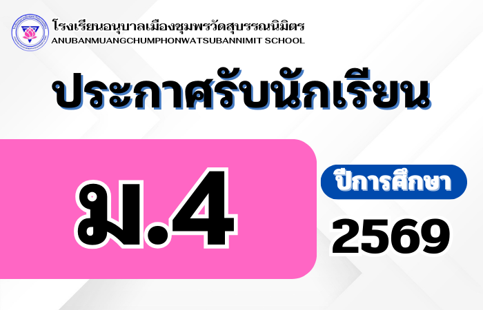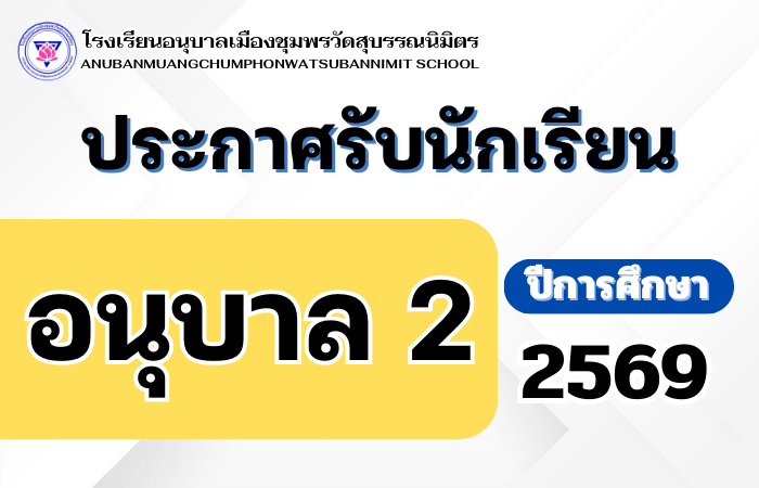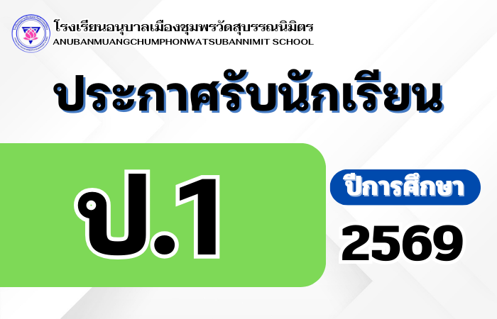 ประกาศโรงเรียนอนุบาลเมืองชุมพรวัดสุบรรณนิมิตร  เรื่อง ผลการคัดเลือกนักเรียนเข้าศึกษาต่อระดับชั้นประถมศึกษาปีที่ 1 ปีการศึกษา 2569 ห้องเรียนพิเศษ (วิทยาศาสตร์ – คณิตศาสตร์ ) กุมภาพันธ์ 7, 2026 ประกาศโรงเรียนอนุบาลเมืองชุมพร…