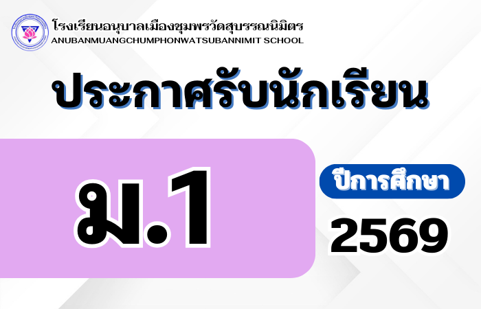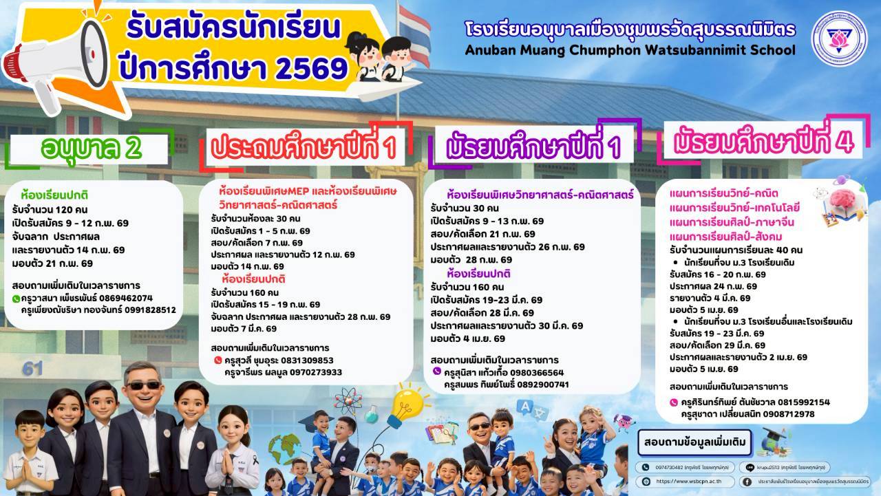 ประกาศโรงเรียนอนุบาลเมืองชุมพรวัดสุบรรณนิมิตร  เรื่อง ผลการคัดเลือกนักเรียนเข้าศึกษาต่อระดับชั้นประถมศึกษาปีที่ 1 ปีการศึกษา 2569 ห้องเรียนพิเศษ Mini English Program (MEP) กุมภาพันธ์ 7, 2026 ประกาศโรงเรียนอนุบาลเมืองชุมพร…